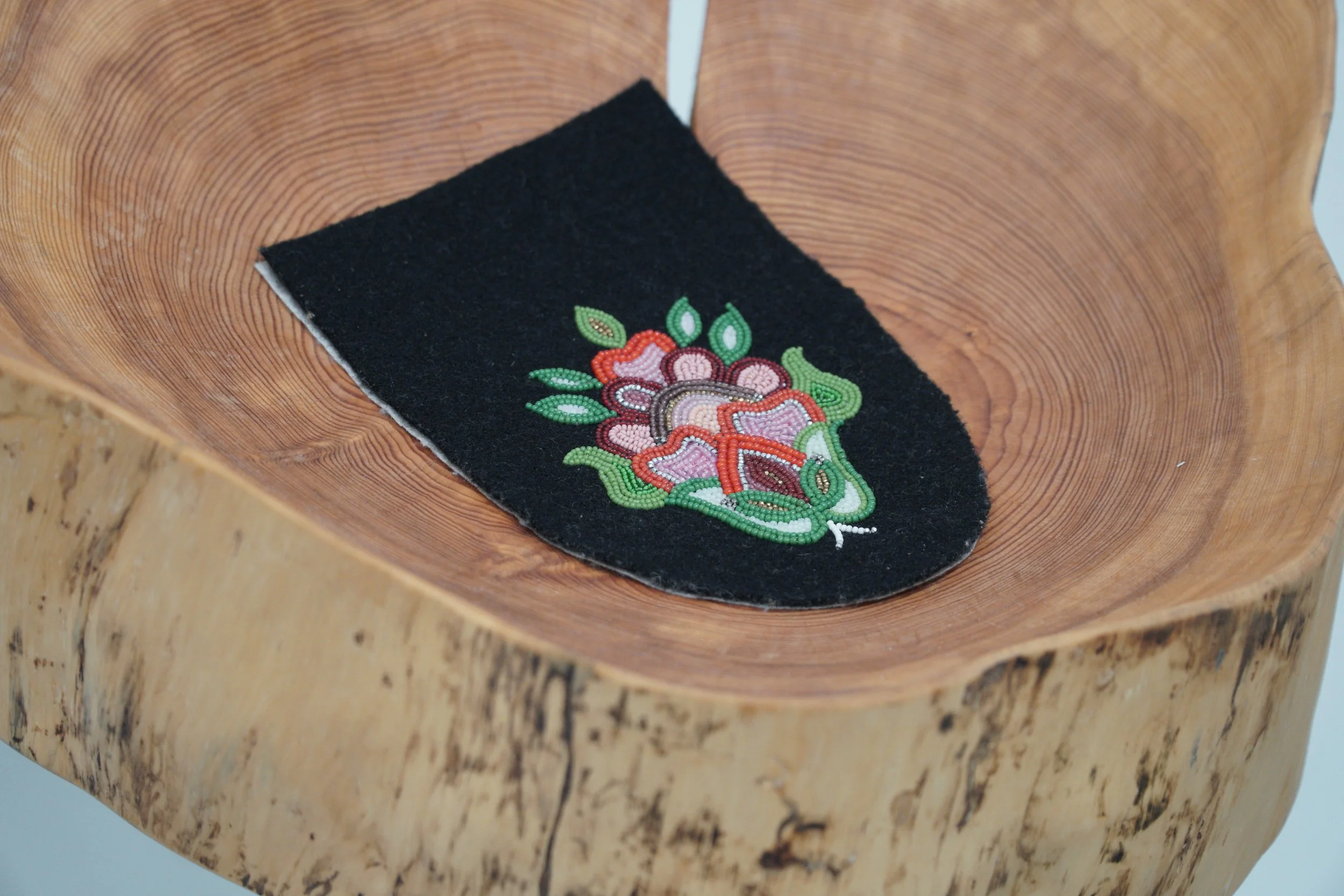 In this 3-hour workshop participants learned how to draw their own floral beadwork patterns based on a pair of Métis hide gauntlets Claire rematriated from a private collection in London, England this past summer. Participants were guided to bead their floral design onto smoked moose hide using the Métis two-needle style.